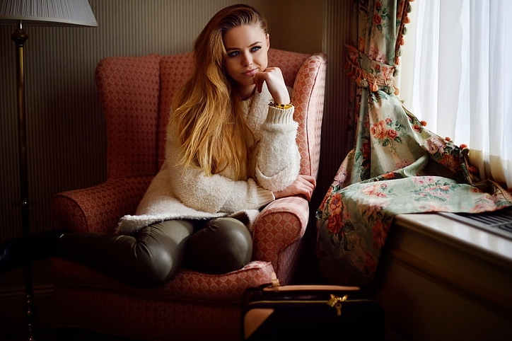 Нежность Kaylee: Роскошная блондинка в чувственном фотосете дома