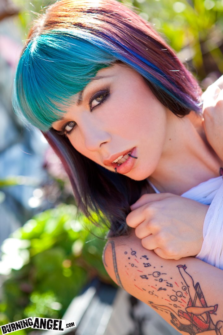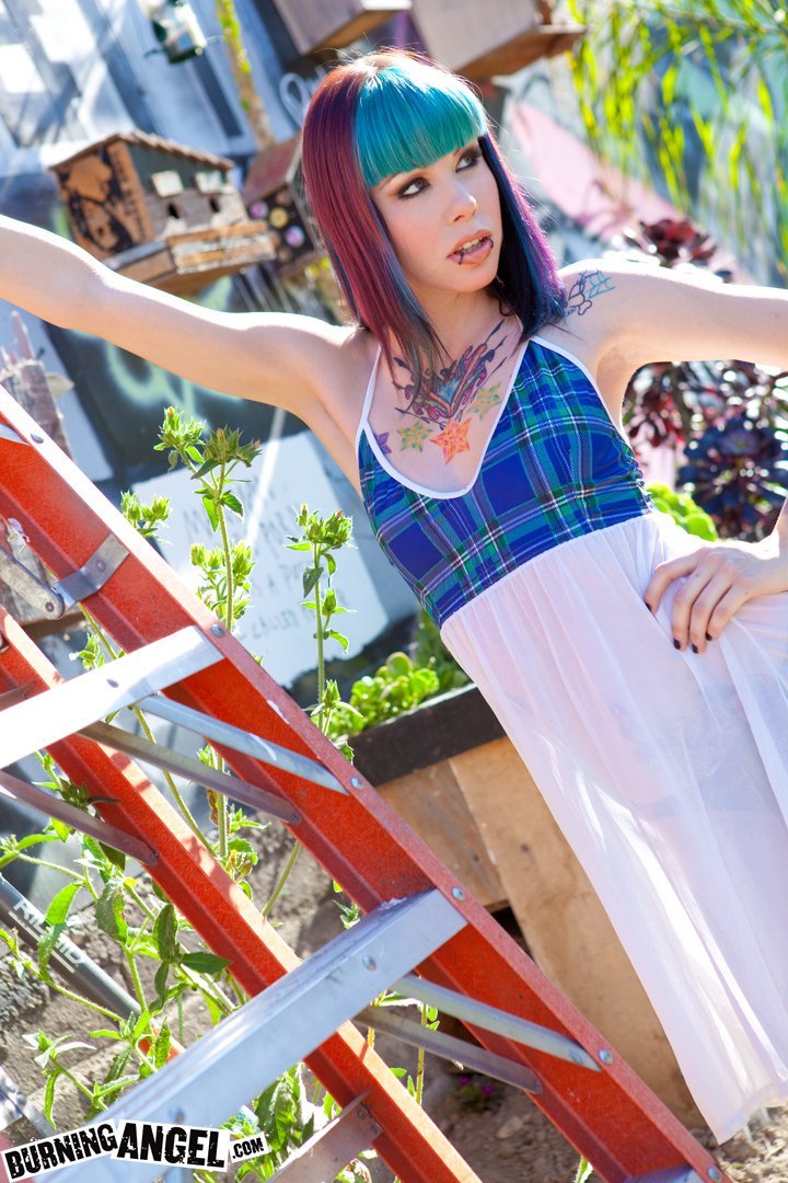 Девушка нимфоманка вся в татуировках, то черепа, то какие-то узоры находится в мастерской и еще обожает демонстрировать задницу раздвигая промежность, то всё это делает в стрингах, которые туго впились в жопу, также у эмо бабы пробиты все её дырочки.
