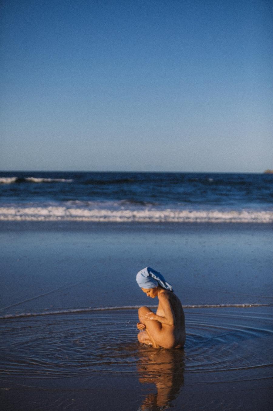 Девушка с голой мокрой попкой обливается холодной водой из шланга