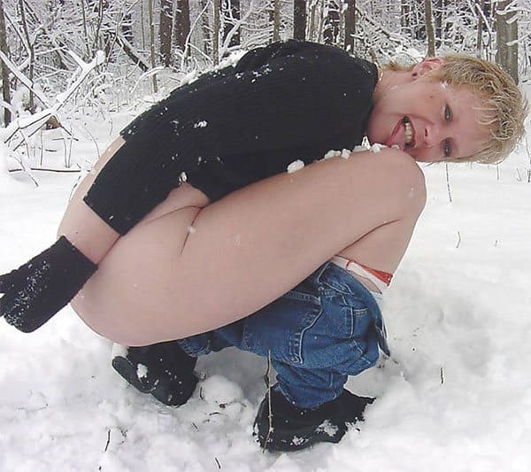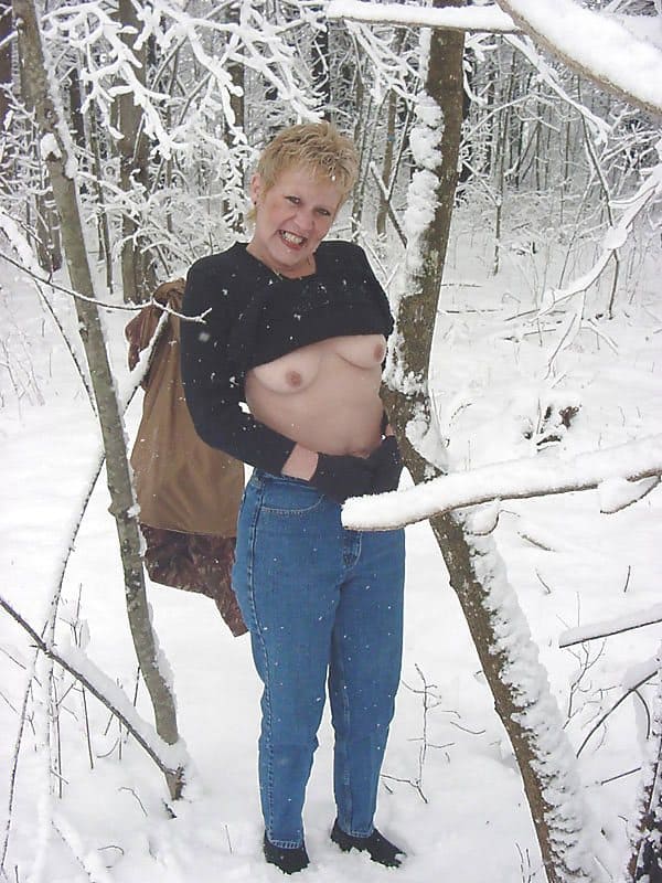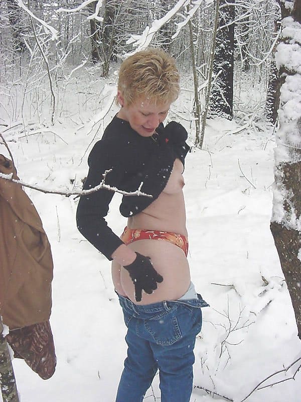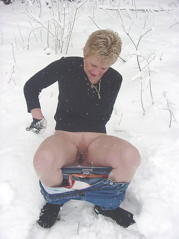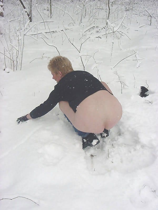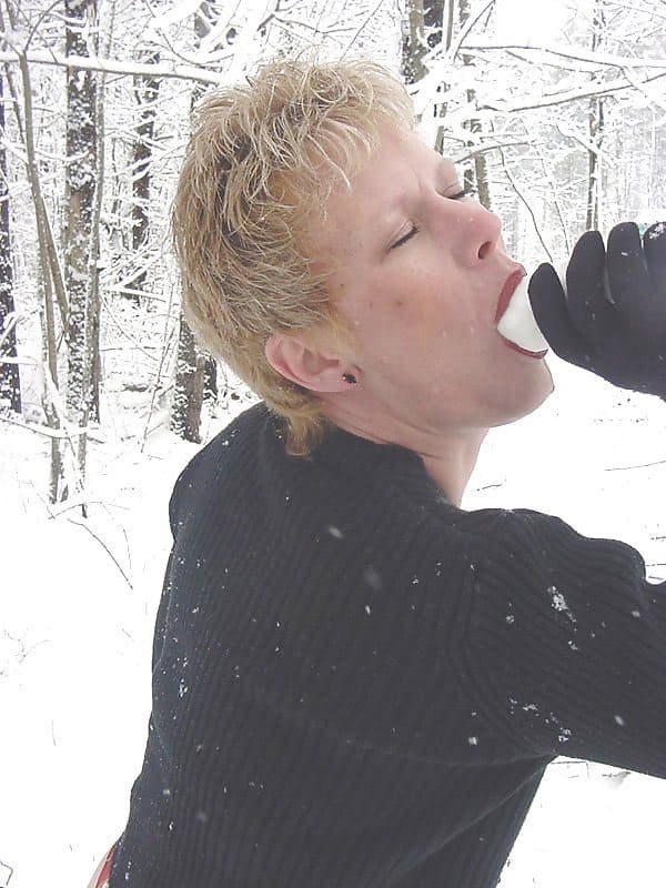 Видимо у бабы кризис средних лет, никто не хочет трахнуть эту зрелую сучку в задницу и приласкать сочный клитор, поэтому старая милфа мастурбирует снежным членом прямо в холодном лесу.